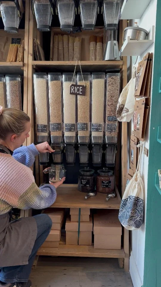 JUNIPER is a cheerful and inviting refill shop in the heart of Petersfield, Hampshire, filled with almost everything you could need in your household cupboards - from rice, porridge oats, chickpeas, chocolate and dried mango to washing-up liquid, floor soap, bubble-bath and gorgeous face creams. We are a packaging free shop, with most of our goods certified as organically produced.